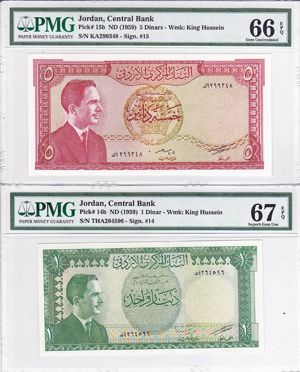 Jordan. Lot includes 5 Dinars, ND (1965), P-15b, PMG Gem Uncirculated 66 EPQ; and 1 Dinar, ND (1965), P-14b, PMG Superb Gem Unc 66 EPQ. TDLR.