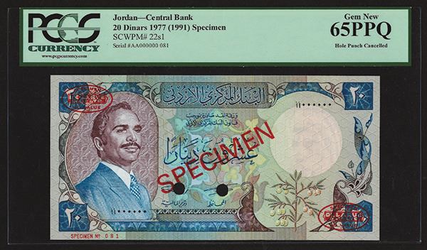 Jordan, specimen 20 Dinars, 1977 (1991), P-22s1, TDLR oval imprints, Specimen No 081. A lovely specimen from a series that was printed in 1977 using the design as the brown 20 Dinars then in circulation, but in blue color instead, as it was intended for use as an emergency issue. This emergency came in 1991 in relation to the Gulf War, and the blue 20 Dinars were briefly released in circulation, until they were quickly replaced in 1992 with an entirely new series. This type is scarce as an issued note but quite rare as specimen as it was not widely distributed to official authorities. Graded Gem New 65 PPQ by PCGS.