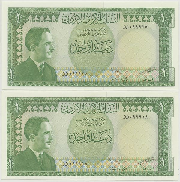 Jordan, ND. Lot of 2 Replacement notes, both are Second Issue - Law 1959, 1 Dinar, P-14c, Issued banknotes, King Hussein at left, Green on m/c, Back: Dome of the Rock at center, S/N's ZZ 099925 and ZZ 099918, both are in Uncirculated to Choice Uncirculated or better. Attractive and fresh notes from a new find. (2)