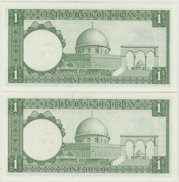 Jordan, ND. Lot of 2 Replacement notes, both are Second Issue - Law 1959, 1 Dinar, P-14c, Issued banknotes, King Hussein at left, Green on m/c, Back: Dome of the Rock at center, S/N's ZZ 099925 and ZZ 099918, both are in Uncirculated to Choice Uncirculated or better. Attractive and fresh notes from a new find. (2)
