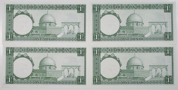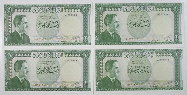 Jordan, ND. Lot of 2 sequential pairs of banknotes, all are Second Issue - Law 1959, 1 Dinar, P-14c, Issued banknotes, King Hussein at left, Green on m/c, Back: Dome of the Rock at center, S/N's 271548-271549; and 271709-271710, All are Uncirculated to Choice Uncirculated or better. Attractive and fresh notes from a new find. (4)
