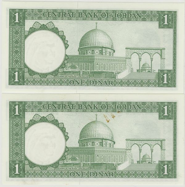 Jordan, ND. Lot of 2 sequential Replacement notes, both are Second Issue - Law 1959, 1 Dinar, P-14c, Issued banknotes, King Hussein at left, Green on m/c, Back: Dome of the Rock at center, S/N's ZZ 099920-ZZ 099921, both are in Uncirculated to Choice Uncirculated or better. Attractive and fresh notes from a new find. (2)