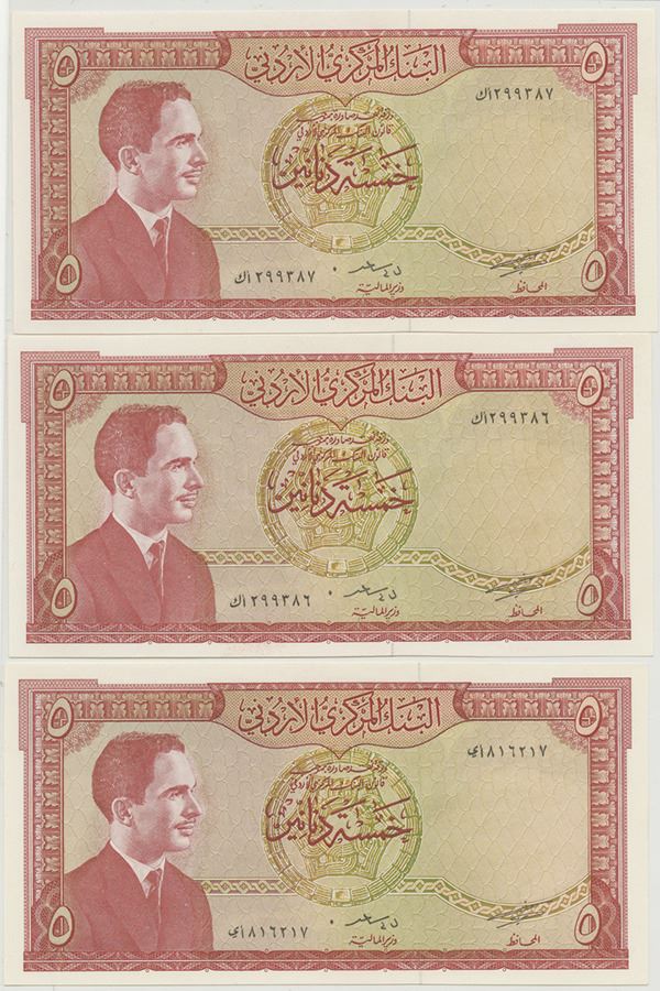 Jordan, ND. Lot of 2 sequential banknotes and one additional note, all are Second Issue - Law 1959, 5 Dinars, P-15b, Issued banknotes, King Hussein at left, Red on m/c, Back: Al-Hazne, Treasury of Pharaoh at Petra at right, Signature 15, S/N's 299386; 299387 and 816217, All are in Uncirculated to Choice Uncirculated or better. Attractive and fresh notes from a new find. (3)