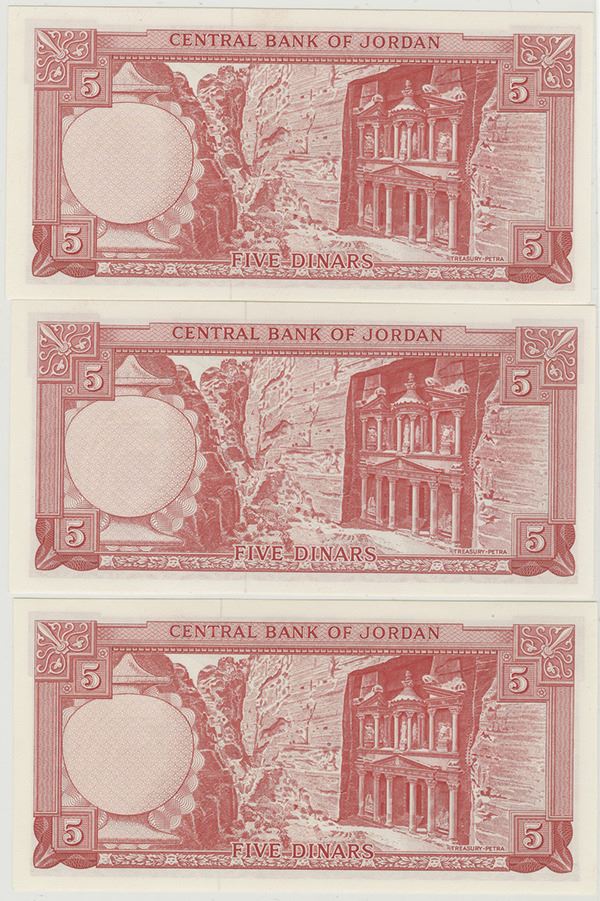 Jordan, ND. Lot of 2 sequential banknotes and one additional note, all are Second Issue - Law 1959, 5 Dinars, P-15b, Issued banknotes, King Hussein at left, Red on m/c, Back: Al-Hazne, Treasury of Pharaoh at Petra at right, Signature 15, S/N's 299386; 299387 and 816217, All are in Uncirculated to Choice Uncirculated or better. Attractive and fresh notes from a new find. (3)