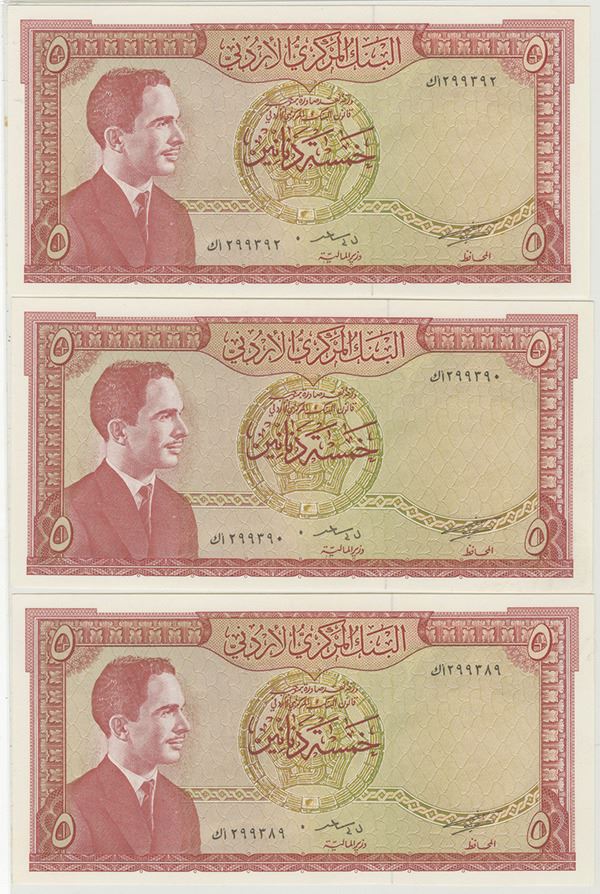 Jordan, ND. Lot of 2 sequential banknotes and one additional note, all are Second Issue - Law 1959, 5 Dinars, P-15b, Issued banknotes, King Hussein at left, Red on m/c, Back: Al-Hazne, Treasury of Pharaoh at Petra at right, Signature 15, S/N's 299389 - 299390 and 299392, All are in Uncirculated to Choice Uncirculated or better. Attractive and fresh notes from a new find. (3)