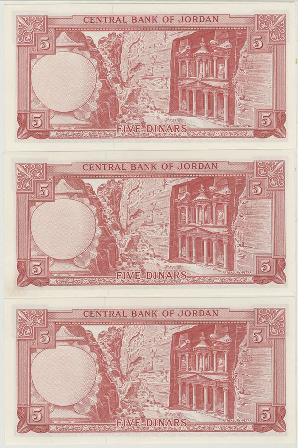 Jordan, ND. Lot of 2 sequential banknotes and one additional note, all are Second Issue - Law 1959, 5 Dinars, P-15b, Issued banknotes, King Hussein at left, Red on m/c, Back: Al-Hazne, Treasury of Pharaoh at Petra at right, Signature 15, S/N's 299389 - 299390 and 299392, All are in Uncirculated to Choice Uncirculated or better. Attractive and fresh notes from a new find. (3)