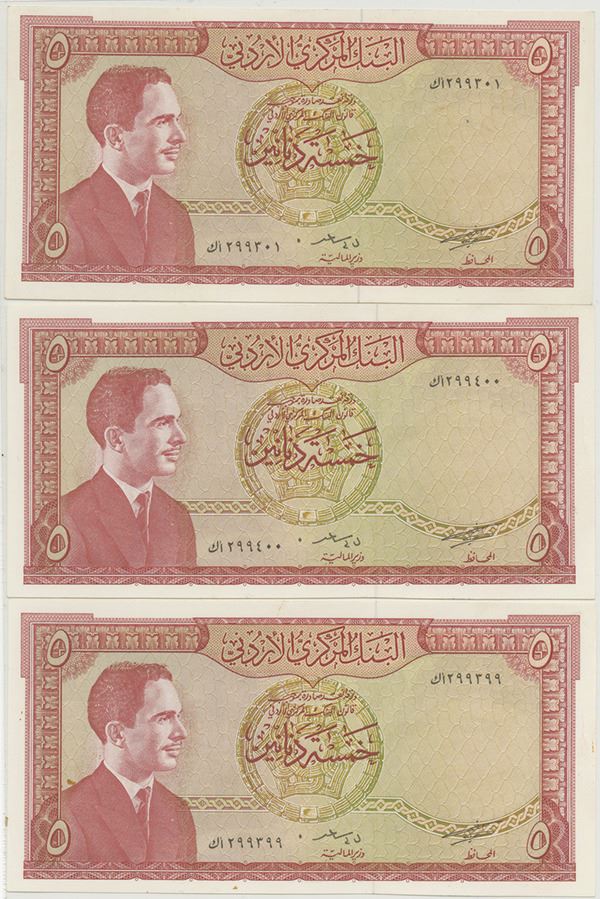 Jordan, ND. Lot of 2 sequential banknotes and one additional note, all are Second Issue - Law 1959, 5 Dinars, P-15b, Issued banknotes, King Hussein at left, Red on m/c, Back: Al-Hazne, Treasury of Pharaoh at Petra at right, Signature 15, S/N's 299399 - 299400 and 299301, All are in Uncirculated to Choice Uncirculated or better. Attractive and fresh notes from a new find. (3)