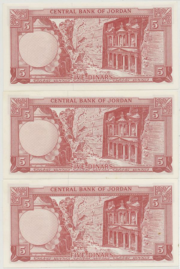 Jordan, ND. Lot of 2 sequential banknotes and one additional note, all are Second Issue - Law 1959, 5 Dinars, P-15b, Issued banknotes, King Hussein at left, Red on m/c, Back: Al-Hazne, Treasury of Pharaoh at Petra at right, Signature 15, S/N's 299399 - 299400 and 299301, All are in Uncirculated to Choice Uncirculated or better. Attractive and fresh notes from a new find. (3)
