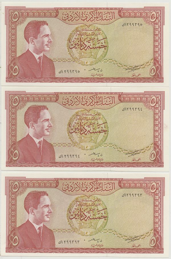 Jordan, ND. Lot of 3 sequential banknotes, all are Second Issue - Law 1959, 5 Dinars, P-15b, Issued banknotes, King Hussein at left, Red on m/c, Back: Al-Hazne, Treasury of Pharaoh at Petra at right, Signature 15, S/N's 299393 - 299395, All are in Uncirculated to Choice Uncirculated or better. Attractive and fresh notes from a new find. (3)