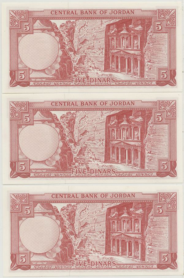 Jordan, ND. Lot of 3 sequential banknotes, all are Second Issue - Law 1959, 5 Dinars, P-15b, Issued banknotes, King Hussein at left, Red on m/c, Back: Al-Hazne, Treasury of Pharaoh at Petra at right, Signature 15, S/N's 299393 - 299395, All are in Uncirculated to Choice Uncirculated or better. Attractive and fresh notes from a new find. (3)