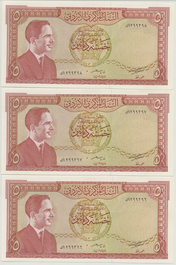 Jordan, ND. Lot of 3 sequential banknotes, all are Second Issue - Law 1959, 5 Dinars, P-15b, Issued banknotes, King Hussein at left, Red on m/c, Back: Al-Hazne, Treasury of Pharaoh at Petra at right, Signature 15, S/N's 299396 - 299398, All are in Uncirculated to Choice Uncirculated or better. Attractive and fresh notes from a new find. (3)