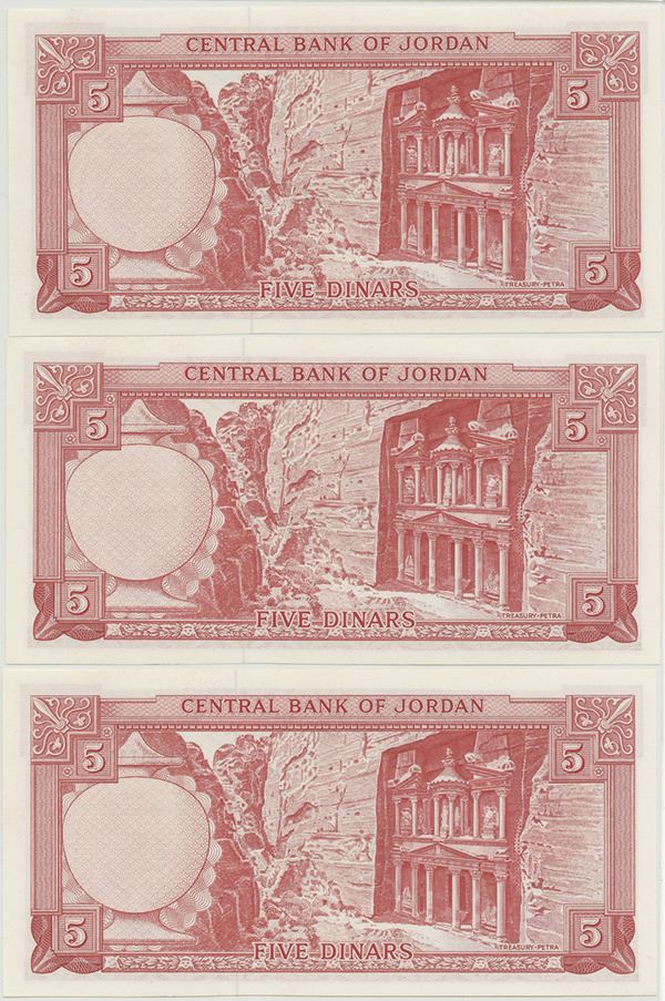 Jordan, ND. Lot of 3 sequential banknotes, all are Second Issue - Law 1959, 5 Dinars, P-15b, Issued banknotes, King Hussein at left, Red on m/c, Back: Al-Hazne, Treasury of Pharaoh at Petra at right, Signature 15, S/N's 299396 - 299398, All are in Uncirculated to Choice Uncirculated or better. Attractive and fresh notes from a new find. (3)