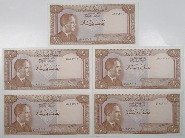 Jordan, ND. Lot of 5 sequential notes, all are Second Issue - Law 1959, 1/2 Dinar, P-13c, Issued banknotes, King Hussein at left, Brown on m/c, Back: Jerash Forum, S/N's 779301 to 779305, All are in Uncirculated to Choice Uncirculated or better. Attractive and fresh notes from a new find. (5)