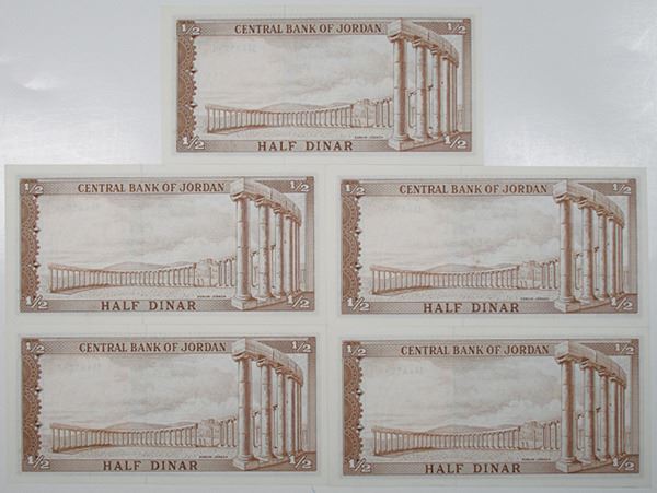 Jordan, ND. Lot of 5 sequential notes, all are Second Issue - Law 1959, 1/2 Dinar, P-13c, Issued banknotes, King Hussein at left, Brown on m/c, Back: Jerash Forum, S/N's 779301 to 779305, All are in Uncirculated to Choice Uncirculated or better. Attractive and fresh notes from a new find. (5)