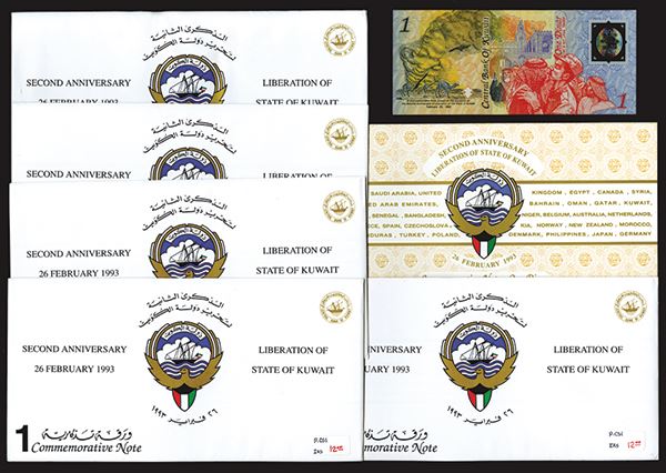 Kuwait. 1 Dinar 1993. P-CS1. Map of Kuwiat. Polymer. Second Anniversary of the Liberation of Kuwait. In commemorative folder with special envelope (dealer price tag in one corner). Choice Uncirculated. 5 pieces.