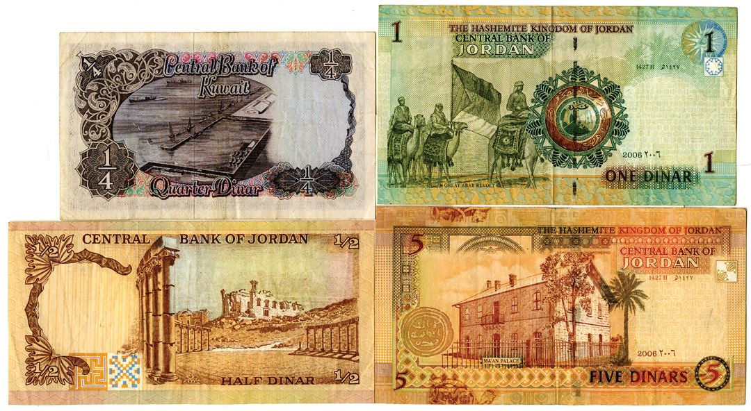 4 pieces: Central Bank of Kuwait, L. 1968, 1/4 Dinar, P-6, Issued banknote, Brown on multicolor. Also included are 3 notes from the Central Bank of Jordan: ND (1975-92), 1/2 Dinar, P-17, Brown on multicolor underprint, Sign. 15; AH1427/2006, 1 Dinar, P-34c, Green and brown with multicolor underprint; and AH1427/2006, 5 Dinar, P-35b, Orange and brown on multicolor underprint. VF condition. (4)