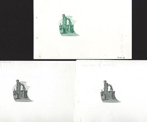 Libya, 1981-2002, Lot of 3 different Progress Proofs of the face vignette of "Ruins" in different engraving states and colors (green or black), All are used on a number of Libya issues including 1980-81 Issue, series 2, 1/4 Dinar, P-42A; 1984 Issue, Series 3, 1/4 Dinar, P-47; 1988-90 Issue - Series 4, 1/4 Dinar, P-52; 1991-93 Issue - Series 4, 1/4 Dinar, P-57 and 2002 Issue - Series 5, 1/4 Dinar, P-62. All are printed on india paper on large card and measure 9 by 6 inches. They are dated between 4/6/79 to 4-16-79. One of 2 sets of 3 different found in the archives. ABNC.