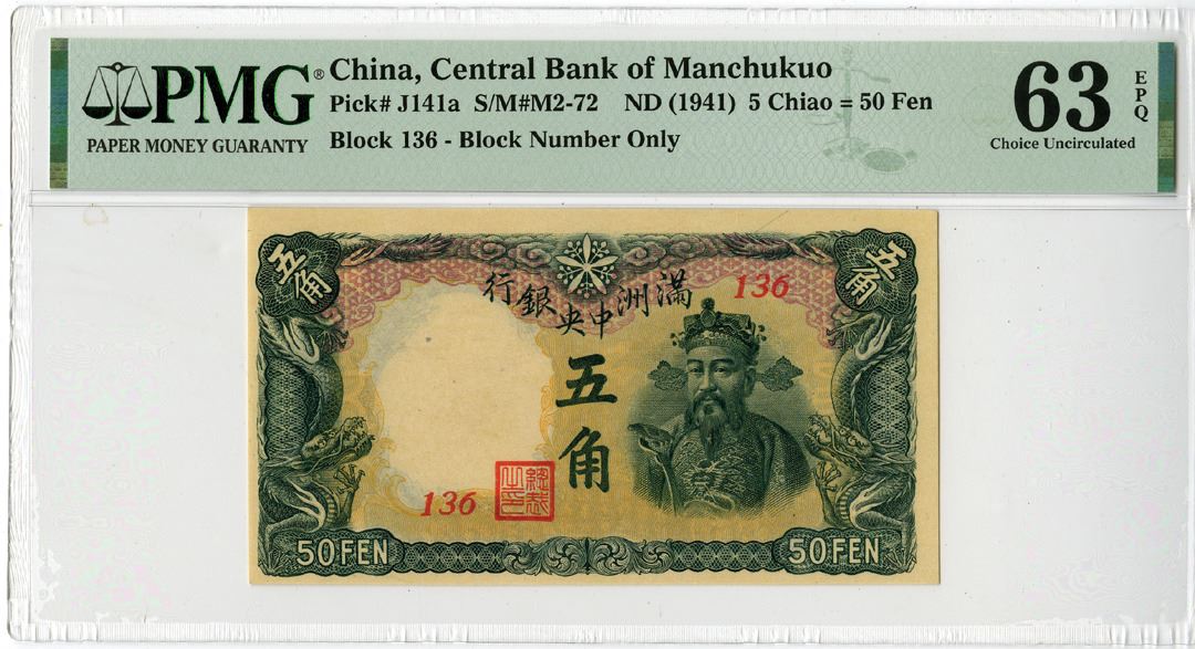China, ND (1941). 5 Chiao = 50 Fen, P-J141a, S/M#M2-72, Issued Banknote, Green on pink and orange underprint with Ch'ien Lung at right, Block 136, PMG graded Choice uncirculated 63 EPQ.