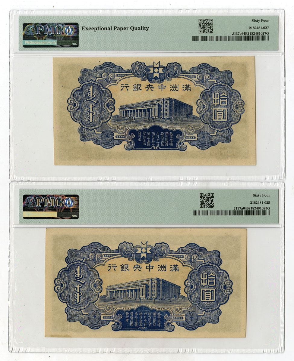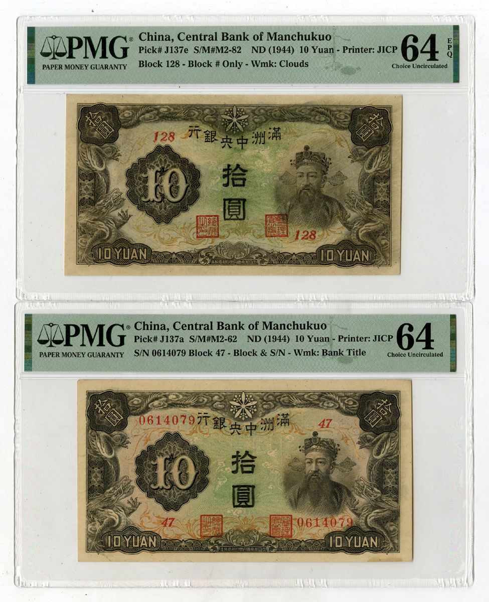China, ND (1944). Lot of 2 Issued Banknotes, Includes: 10 Yuan, P-J137a S/M#M2-62, Black on pink and green underprint, S/N 0614079 Block 47, PMG Choice Unc 64; 10 Yuan, P-J137e S/M#M2-82, Black on green underprint, Block 128, PGM Choice Uncirculated 64. Both notes are printed by JICP. (2). Sold "AS IS" no returns accepted.