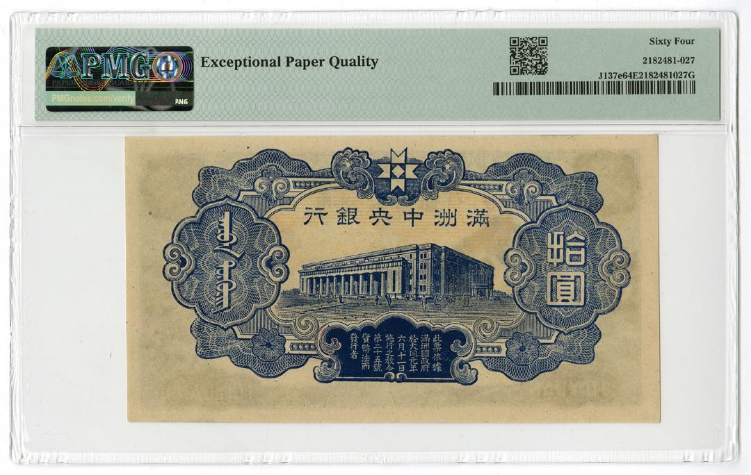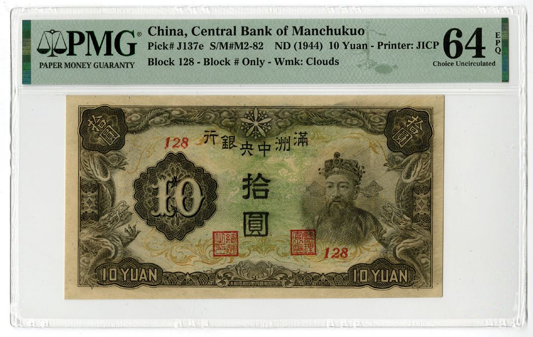 China, ND (1944). 10 Yuan, P-J137e, S/M#M2-82, Issued Banknote, Black on green underprint at center and gold at bottom, Portrait of Emperor Ch'ien Lung at right, Block 128, PMG graded Choice Uncirculated 64 EPQ, Printer: JICP.
