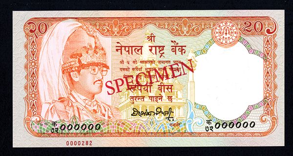 Central Bank of Nepal, 1988-96 ND Issue Specimen. Nepal, 20 Rupees, P-38 s, Specimen, Signature 12, Specimen overprints, Gem Uncirculated Condition.