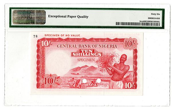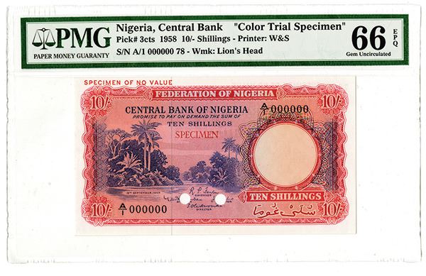 Nigeria. Color Trial Specimen 10 Shillings, 1958, P-3cts. PMG graded Gem Unc 66 EPQ (Cert # 5003615-016). W&S.