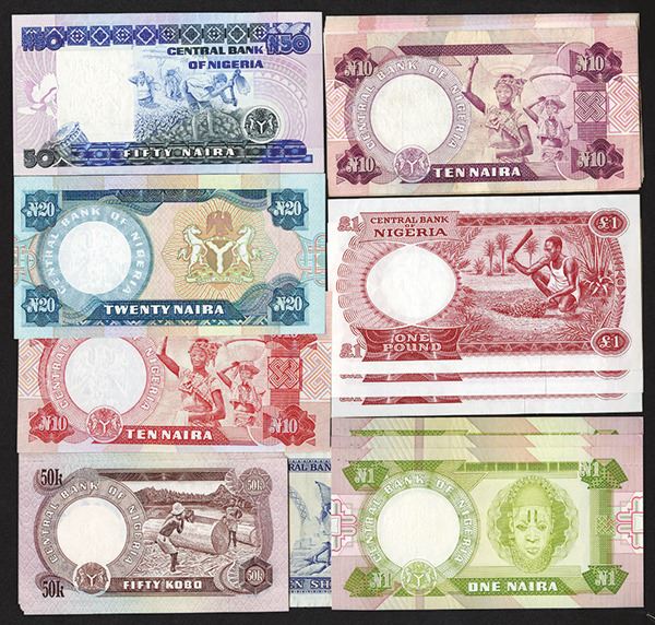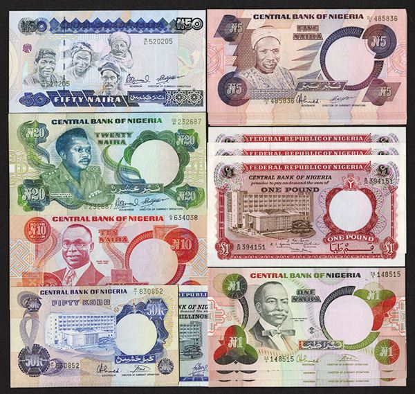 Nigeria. 10 Shilling, 1 Pound; 50 Kobo, 1; 5, 10, 20, 50 Naira. P-7, 8 (4); 14 (5); 23 (3); 24 (11); 25a (2 marked in ink COUNTERFEIT); 25d; 26e; 27b. The Counterfeits are Very Fine; most others are Choice Uncirculated. 29 pieces.