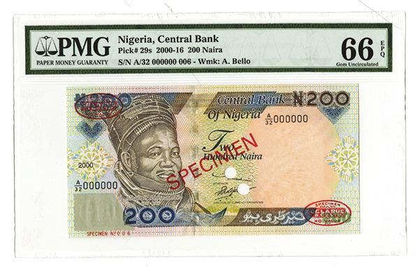 Nigeria, specimen 200 Naira, P-29s, PMG graded Gem Uncirculated 66 EPQ, Specimen No. 006.