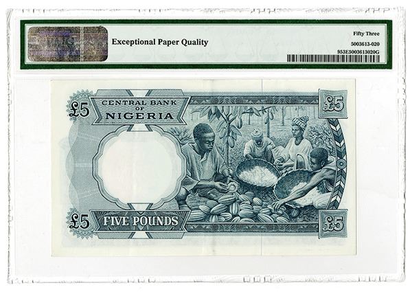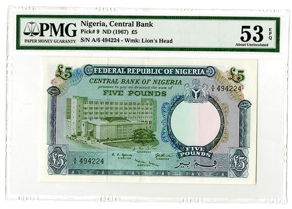 Nigeria. Issued 5 Pounds, ND (1967), P-9. PMG graded About Unc 53 EPQ (Cert # 5003613-020).