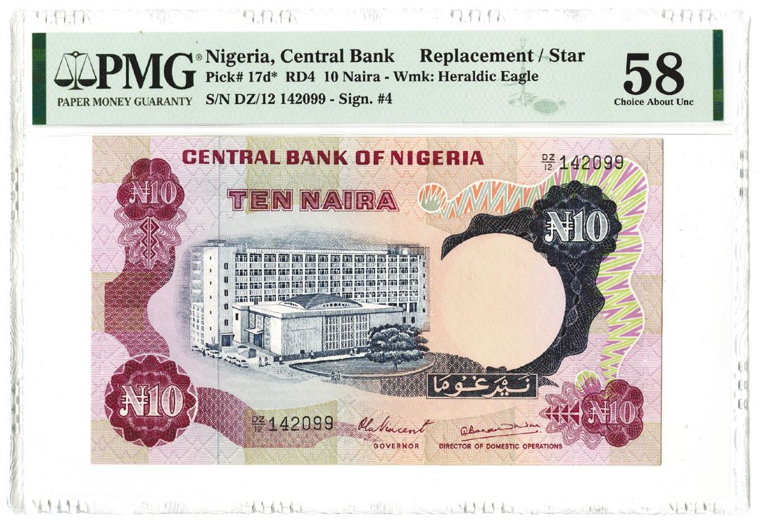 Nigeria. ND (1973-78), 10 Naira, P-17d* Issued Replacement Note, Signature #4, Carmine & Dark blue on m/c, Bank building at left, back with dam at center, S/N DZ/12 142099, PMG graded Choice About Uncirculated 58, Rare note and signature variety in any condition. This is the third of 3 sequential examples in this auction. No high grade examples of this note has been offered previously at auction as well as any replacement examples either.
