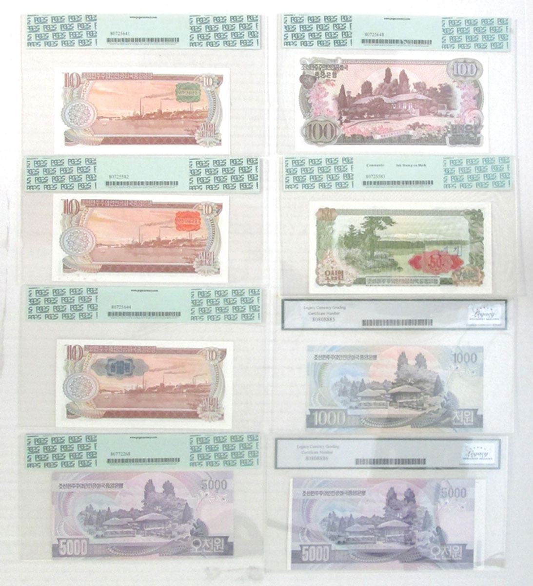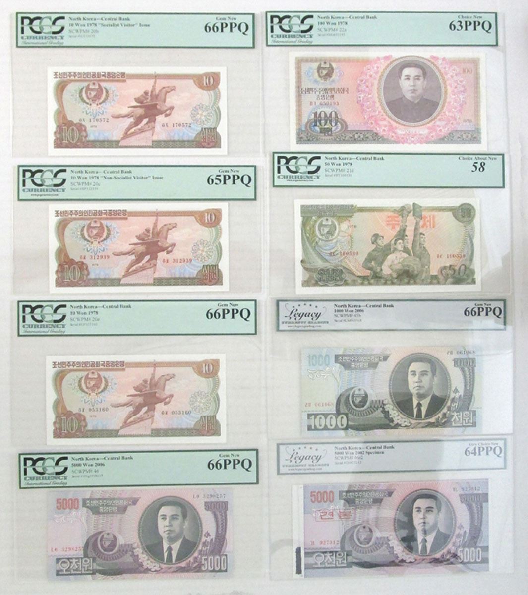 North Korea, 1978-2006. Lot of 8 Legacy & PCGS Graded Banknotes, Includes: 50 Won, P-21d, S/N HT100530, PCGS graded Choice About New 58 with comment "Ink Stamp on Back"; 100 Won, P-22a, S/N MG650193, PCGS graded Choice New 63 PPQ. (2); 10 Won, P-20b, P-20c, and P-20e, S/Ns: HJ170572, HP053160, and HP312939, PCGS graded, One is Gem New 65 PPQ and the other two are Gem New 66 PPQ; 1000 Won, P-45b, S/N LM061068, LCG graded Gem New 66PPQ; 5000 Won, P-46, S/N NNg3298257, LCG graded Gem New 66PPQ; 5000 Won, P-46s2, Specimen Banknote, S/N GN927312, LCG graded Very Choice New 64PPQ. (8). Sold "AS IS" no returns accepted.