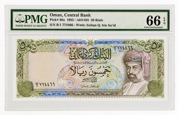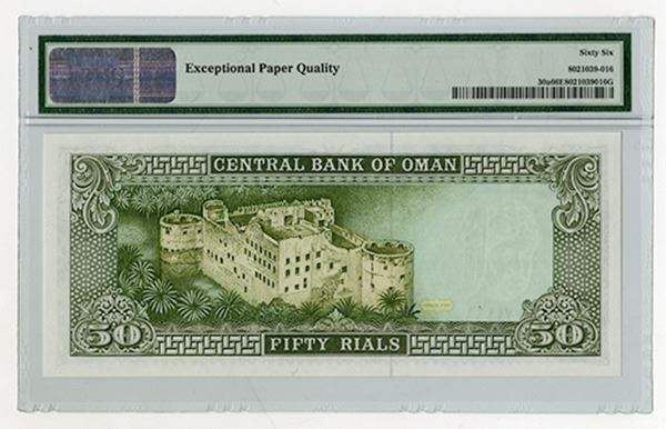 Oman. 50 Rials, P-30a, Issued, S/N B/1 774466, PMG Gem Uncirculated 66 EPQ.