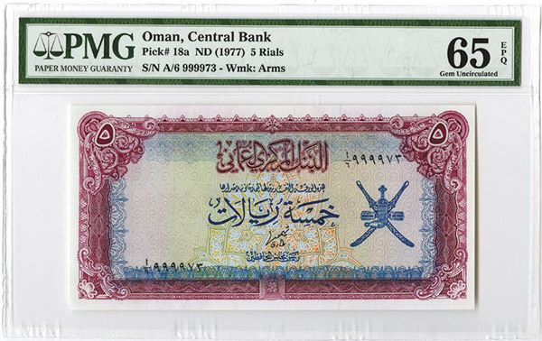 Oman, issued 5 Rials, P-18a, PMG graded Gem Uncirculated 65 EPQ.