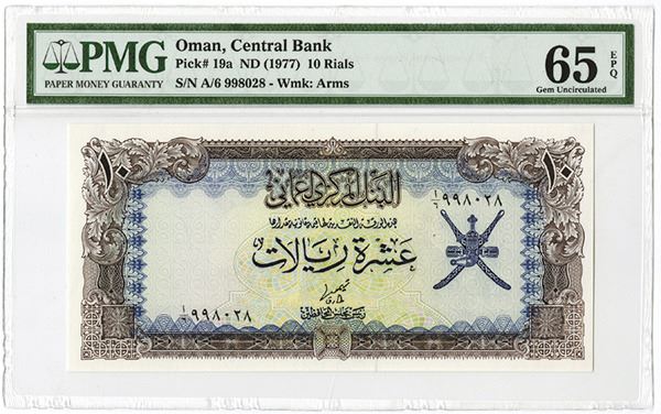 Oman, issued 10 Rials, P-19a, PMG graded Gem Uncirculated 65 EPQ.