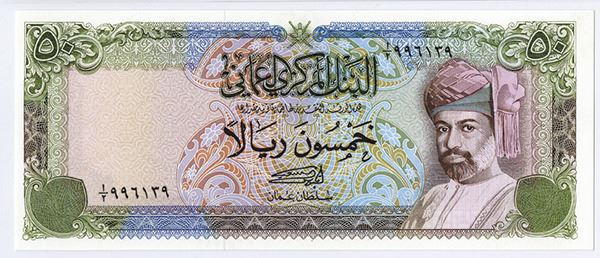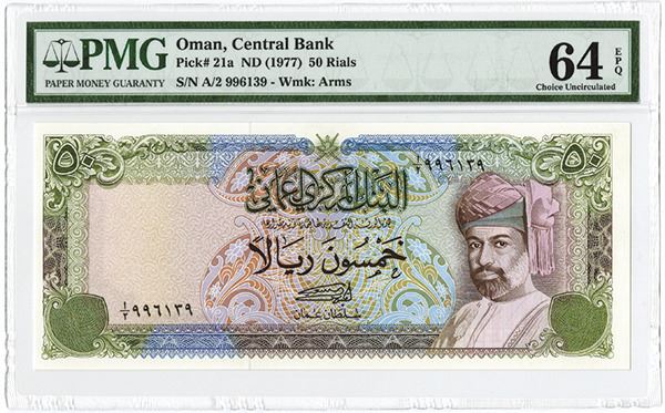 Oman, issued 50 Rials, P-21a, PMG graded Choice Uncirculated 64 EPQ.