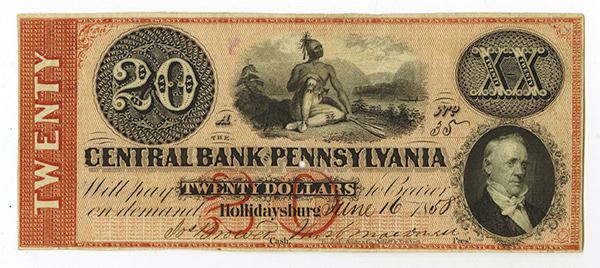 Hollidaysburg, Pennsylvania. $20, Haxby PA-175-G12a, Issued, black on brown orange underprint, Native American in middle, Notable (Buchanon?) at lower right, S/N 35, Choice Very Fine condition with a very small worm hole in middle and bright attractive colors. DW&C.