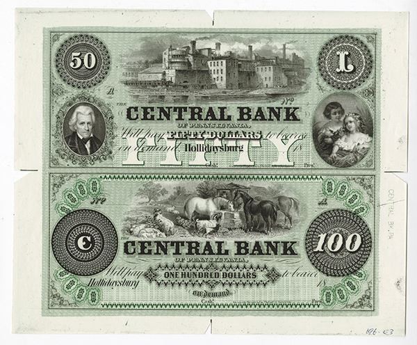 Hollidaysburg, Pennsylvania. 18xx. Uncut Sheet of 2 Proprietary Proof notes, $50-$100, Haxby PA-175-G14-G16 Unlisted Color, Printed in unissued colors, the issued notes were printed black on brown orange underprint, these were printed Black on green underprint, The $50 has Jackson at left, young girls at right, large factory on top, the $100 note has horses, goats and sheep drinking water in middle, Printed on thin paper with archival notations on the bottom. Uncirculated to CU condition. Rare notes in any format. DW&C.