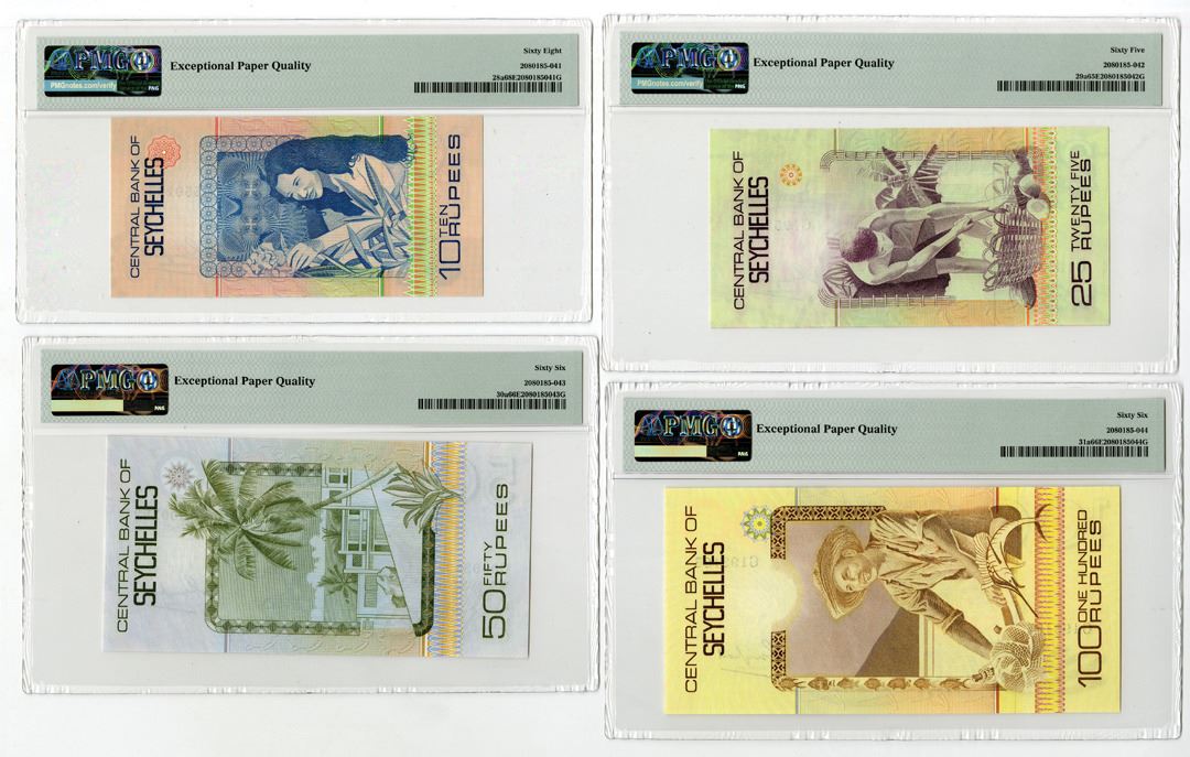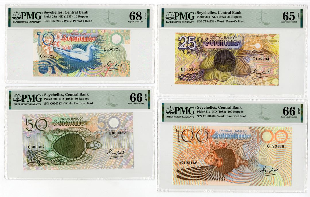Seychelles. ND (1983). Lot of 4 Issued banknotes: 10 Rupees, P-28a, PMG graded Superb Gem Uncirculated 68 EPQ; 25 Rupees, P-29a, PMG graded Gem Uncirculated 65 EPQ; 50 Rupees, P-30a, PMG graded Gem Uncirculated 66 EPQ; and 100 Rupees, P-31a, PMG graded Gem Uncirculated 66 EPQ. (4)