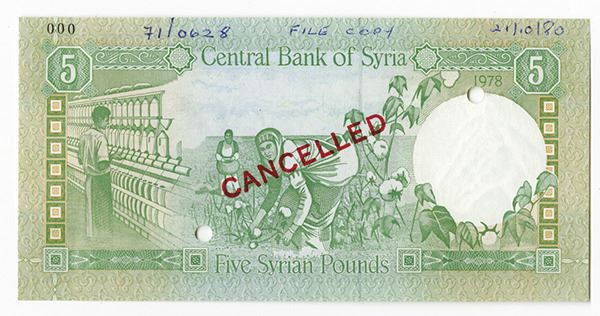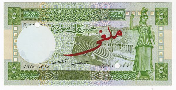 Syria. Specimen 5 Pounds, 1978 (21.10.1980 date indicated in margin annotation), P-100as, S/N T16 000000, overprinted CANCELLED in English on Back and Arabic ____ on Front, Choice Uncirculated.