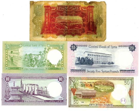 Syria......., Lot of 5 banknotes Includes: Banque de Syrie et du Grand-Liban 1 Livre, 1939, P-40a; Central Bank of Syria group of notes includes 5 Pounds, 1988, P-100d; 10 Pounds, 1988, P-101d; 25 Pounds, 1988, 102d; 50 Pounds, 1998, P-107. Notes range from Fine-UNC condition. (5)