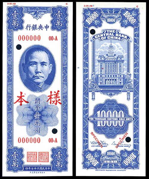 10,000 CGU, Color Trial essay specimen of proposed design for P-363. Blue front and back. Obverse has red “3-31-48 - C” on the top and red “00000” serial numbers with POC's, back has same text on top border. The face and back are each PMG graded Superb Gem Uncirculated 67 EPQ, The color is slightly different than the issued note. Only 8 notes graded in the PMG census, this and one other are tied for finest known. SBNC.