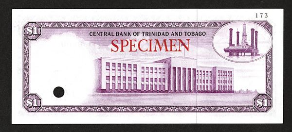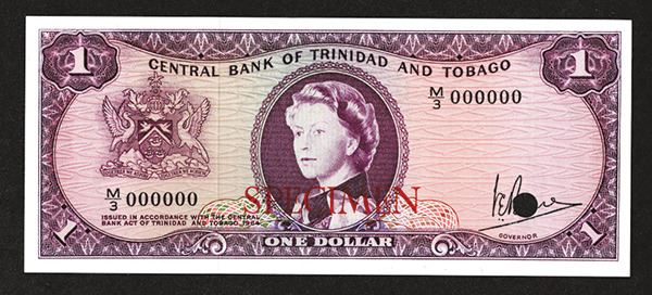 Trinidad & Tobago. 1 Dollars. P-26cts. Elizabeth II at center, central bank on back. Signature 3. Purple on multicolor underprint. Red SPECIMEN overprint on each side, POC, printed number at top margin on back. Choice Uncirculated.