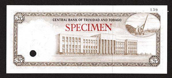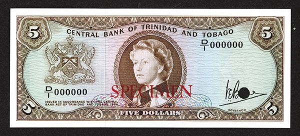 Trinidad & Tobago. 5 Dollars. P-27cts. Elizabeth II at center, central bank on back. Signature 3. Brown on multicolor underprint. Red SPECIMEN overprint on each side, POC, printed number at top margin on back. Choice Uncirculated.