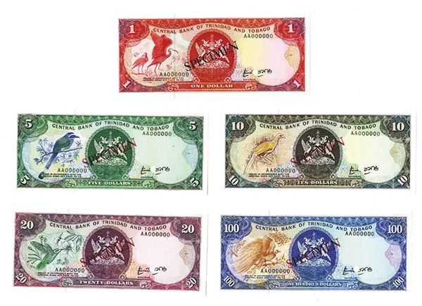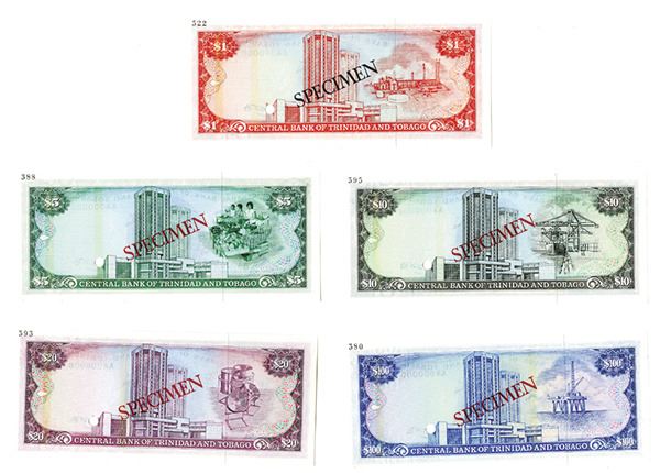 Trinidad & Tobago. Includes 5 specimen banknotes. All are 1977 Issue specimens, includes $1, P-30b; $5, P-31b; $10, P-32 Unlisted (Signature 4 on note, only signature 3 listed); $20, P-33 Unlisted (Signature 4 on note, only signature 3 listed); $100, P-35b. All are unlisted as specimens in SCWPM. Scarce set with unlisted varieties. All are in Choice to Gem Uncirculated condition. Very attractive and rare set.
