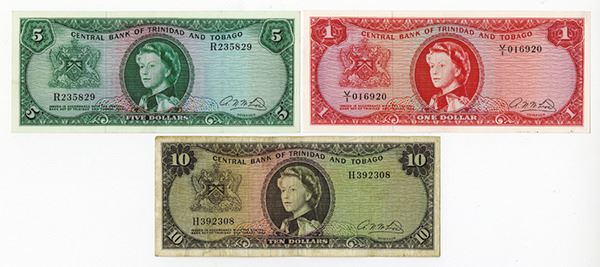 Trinidad and Tabago, Lot of 3 notes, Includes $1; $5 and $10, P-26b; 27b; 28b, all are issued, CU; AU and the $10 in Fine to VF condition. Attractive trio of notes.
