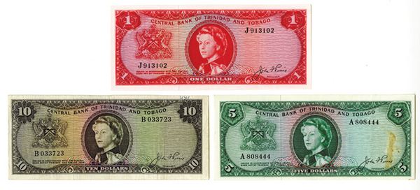 Trinidad and Tabago, Lot of 3 notes, Includes $1; $5 and $10, P-26a; 27a; 28a, all are issued, Choice VF/XF; XF with stain at right and Fine to VF with 4 small pin holes on the top left. Attractive trio of notes.