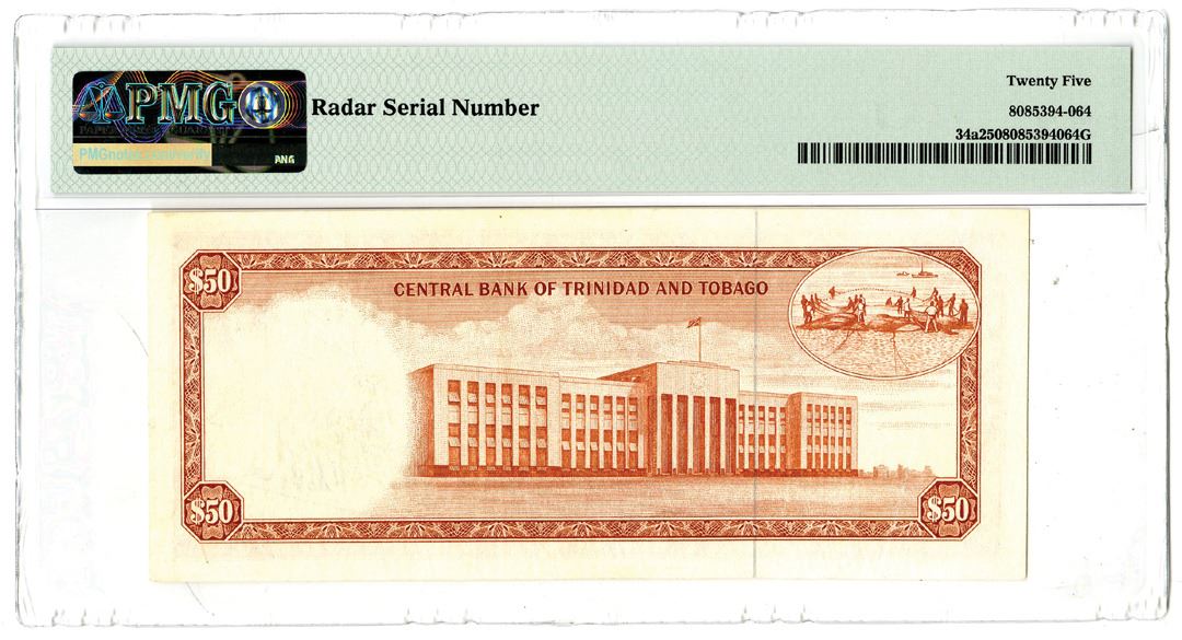 Trinidad & Tobago. 1963 (ND 1977). 50 Dollars, P-34a, Issued banknote, Brown and multicolor, S/N AA058850 - With Engraving Error (Date), PMG graded Very Fine 25 with comment "Radar Serial Number".