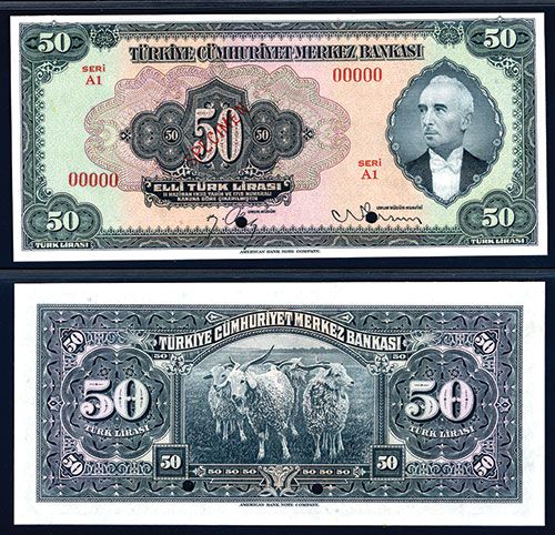 Turkey, L.1930 ND (1947), 50 Lira, Ser. A1, P-143s (PulkoC22), Specimen banknote, Slate blue on m/c, Portrait of President Inonu at right with white tie, Specimen overprints, POC's and “00000” serial numbers, PMG graded Gem Uncirculated 65 EPQ. Rare and desirable note in any form. ABNC.
