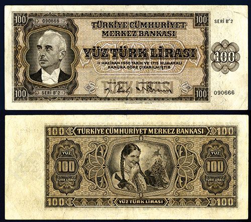 Turkey, L.1930 (1942), 100 lira, P-144a, Dark and light brown, Portrait of Inonu on left, VF condition.