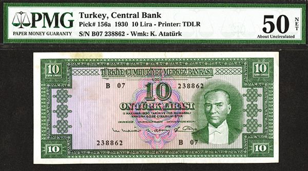 Turkey. 10 Lirasi. P-156a. Ataturk at right, bridge on back. TDLR. Graded PMG About Uncirculated 50 NET, tear, thinning notations.